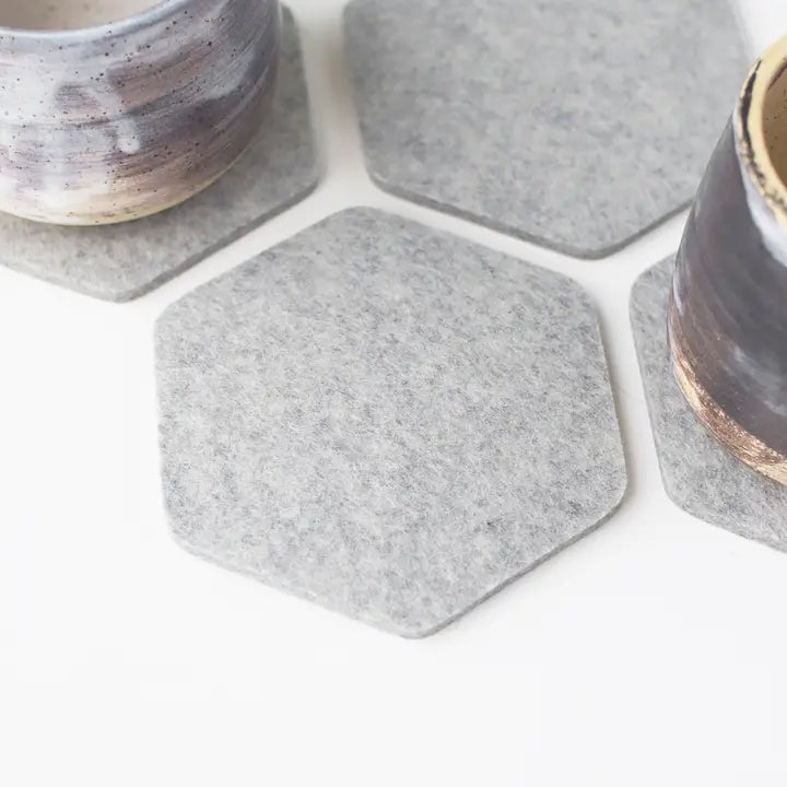 Set of 4 hexagonal coasters to rest your drink and soak up drips.